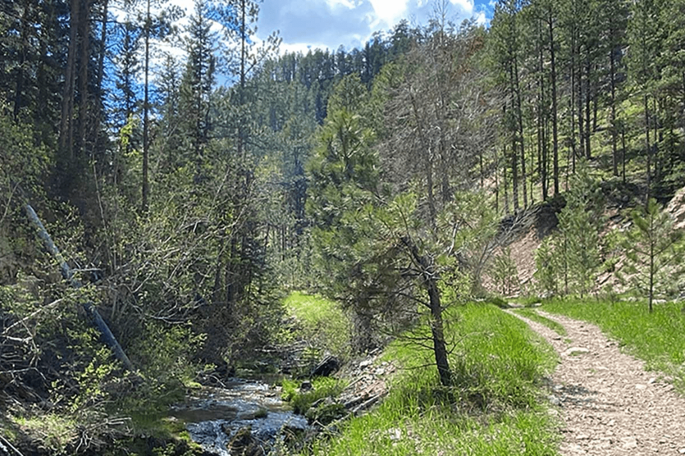 Iron Creek Trail in Spearfish Canyon wanders through a forest of ponderosa, oak, aspen & birch trees as it follows the creek. Along the way you will see beautiful canyon scenery including a small waterfall, since the creek flows next to the trail. This trail does eventually connect with Loop D of Big Hill if you want to add on some mileage. On your way back to the start of the trail you will see the Iron Creek Arch.