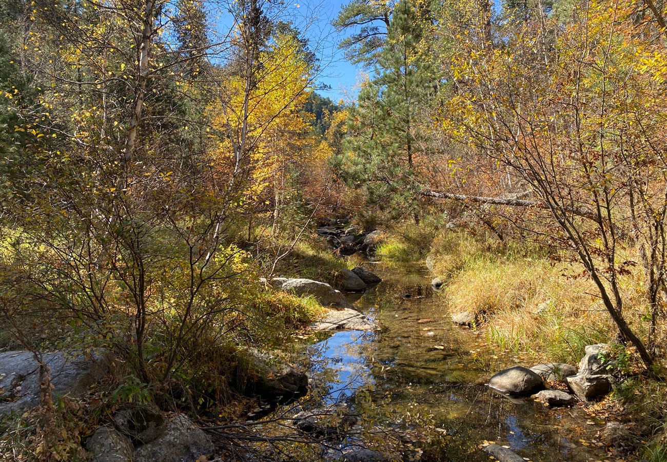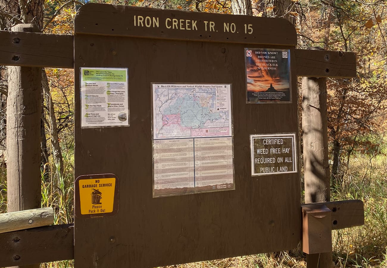 Iron Creek Trail in the Southern Hills offers an easy, scenic outdoor adventure just outside the southern boundary of the Black Elk Wilderness. Following an old roadbed, this beginner-friendly trail gently winds through a diverse forest of ponderosa pine, oak, aspen, and birch. One of the highlights of Iron Creek Trail is its 11 shallow water crossings, adding a refreshing and immersive element as the route meanders alongside the creek.