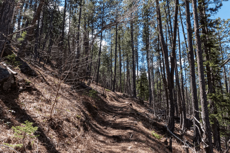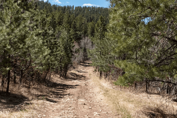 Over the next couple of miles, the ups and downs in the trail were a bit more gradual. The path was filled with large rocks, but it wasn’t difficult to walk since it was more like an old logging road. This was followed by one more uphill climb that lasted about half a mile and brought me to the highest point on this section of trail. This is where I started to get my first real views of the surrounding Black Hills.